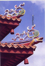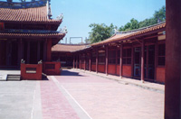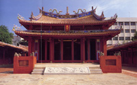 大成殿 聳立於寬敞合院之中,仰之彌高,進謁彌敬。其建築形式為單棟、歇山、重簷,兩側挑簷由山牆而出,允為特色; 墊高臺基,氣勢宏偉。殿前設露臺,為祭孔釋奠大典時六佾舞之所; 欄牆上八隻石獅,姿態互異、趣味橫生,為莊肅穆的孔子廟添點輕鬆畫面。隔扇門採光良好,內外空間連合一氣,更增加明朗舒暢的感覺。屋頂上飾物,無論剪黏、木鐸、藏經筒皆有其喻意,凡人尋味。又因周代人顏色尚朱,故孔子廟牆壁皆為朱漆。 |
