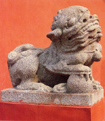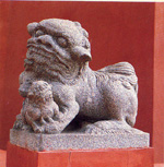 母獅石刻 造形與公獅相同,唯以閉口露牙,以示剛柔並濟,懷抱小獅,或撫或仰,母子情深,油然而生。 |