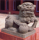 公獅石刻 花岡石質,縱橫皆約35公分,清代作品,立於大成殿臺基欄牆之上。公獅禿頭大眼、張口裂牙,一副勇猛之狀,頸上鈴鐺有被制伏與寵物之意,踩球呈現英姿,也有吉祥歡欣之意。 |